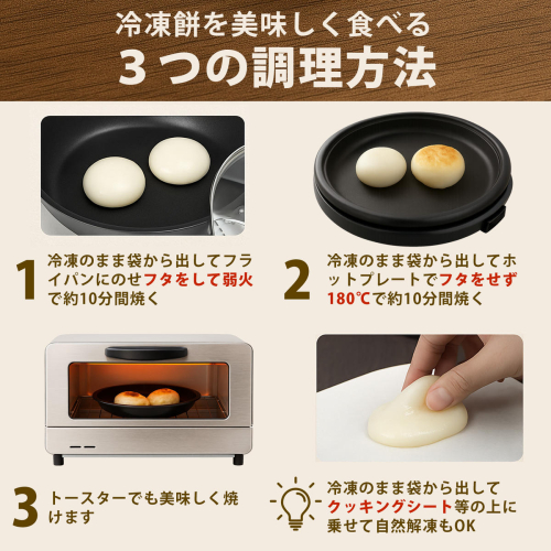 急速冷凍することで、もち米が含んでいた水分を、そのままお餅の中に閉じ込めることに成功!ご自宅でも「伸び~~る」お餅を楽しんでいただけます!