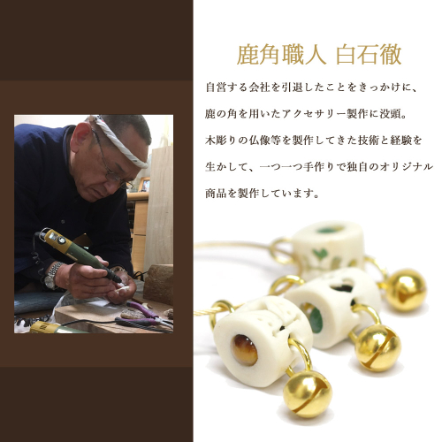 元々、木彫りの仏像等を製作。自営する会社を引退したことをきっかけに、鹿の角を用いたアクセサリー製作に没頭。鹿は害獣として扱われているが、昔から神聖な動物として言い伝えられてきた。その角を用いた商品は高級品として流通しているが、一つ一つ手彫りで製作したものはあまりない。そこで、自分が今まで木彫りで製作してきた技術を生かして独自のオリジナル商品を製作。