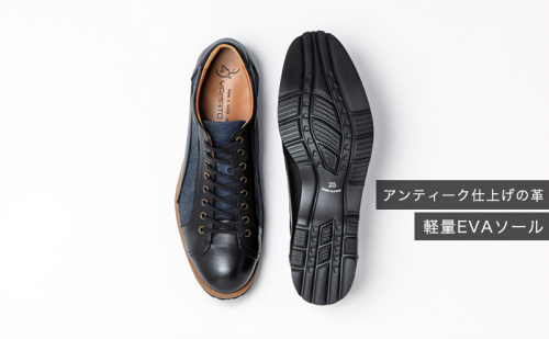 デニムの聖地岡山のデニムと日本有数の革の生産地姫路の牛革、そして地場産業で靴の生産が盛んな奈良県大和郡山市の製造という日本のものづくりを結集させた逸品。岡山県倉敷市児島ジャパンブルー社の国産デニム生地と牛革が見事にマッチングしており、デニムパンツやチノパンなど幅広いスタイルに合う。見た目はスリムだがゆったりとした足入れ感が特徴。片足約290g(25.5cm片足基準)でとても軽量。