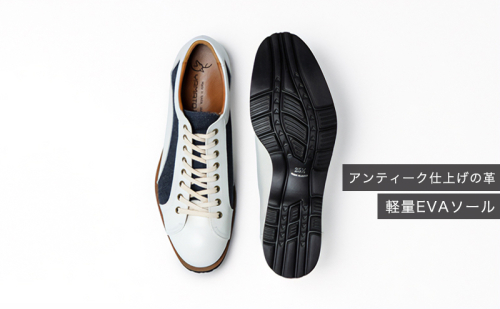 『岡山デニム×姫路牛革×奈良(大和郡山)製造という産地コラボ。ジャパンメイドレザー×ジャパンデニムシューズ』 デニムの聖地岡山のデニムと日本有数の革の生産地姫路の牛革、そして地場産業で靴の生産が盛んな奈良県大和郡山市の製造という日本のものづくりを結集させた逸品。岡山県倉敷市児島ジャパンブルー社の国産デニム生地と牛革が見事にマッチングしており、デニムパンツやチノパンなど幅広いスタイルに合う。見た目はスリムだがゆったりとした足入れ感が特徴。片足約290g(25.5cm片足基準)でとても軽量。 【サイズの目安】はスニーカーのサイズから0.5cm~1cm下、革靴のサイズからは表示サイズ相応か0.5cm下。ワイズは3E相当。サイズ感はやや大きめ。弊社社員の実例 : 足長ー左251.5mm 右252.2mm 足囲ー左253.1mm 右254mm 足幅ー左99.2mm 右101.7mm → 25.5cmでピッタリ(通常スニーカーは26.5cmを履きます)