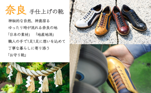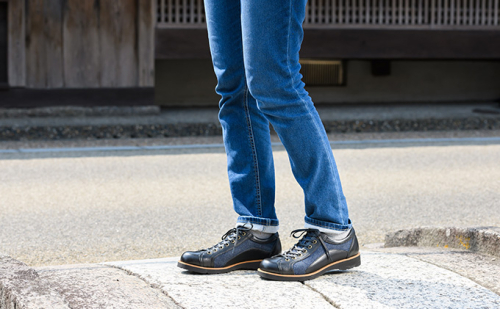 デニムの聖地岡山のデニムと日本有数の革の生産地姫路の牛革、そして地場産業で靴の生産が盛んな奈良県大和郡山市の製造という日本のものづくりを結集させた逸品。トレンドのデニムと牛革が見事にマッチングしておりパンツスタイルからスカートスタイルまで合わせることができ、オシャレの幅が広がる。しかも片足約250g(23.5cm片足基準)でとても軽量。カラーはブラック。サイズは22.5cm~24.5cm(0.5cm刻み)。