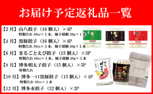 【随時発送開始】 餃子好きにはたまらない、ぎょうざの山八の餃子定期便! こちらのセットは、年6回偶数月にお届けします。 2月:山八餃子 4月:黒豚餃子 6月:まるごとえび餃子 8月:博多明太子餃子 10月:博多一口黒豚餃子 12月:博多水餃子 ※寄附翌月以降の予定月から発送いたします。