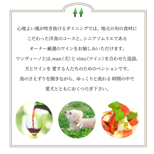 ワンヴィーノとは、wan(犬)とvino(ワイン)を合わせた造語。犬とワインを 愛する人たちのためのペンションです。鳥のさえずりを聞きながら、ゆっくりと流れる 時間の中で愛犬とともにおくつろぎ下さい。