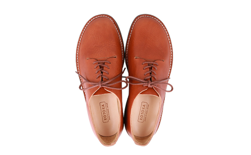 奈良県大和郡山市は日本有数の革靴の産地。この地で昔からひたむきに革靴作りに向き合ってきた靴メーカー7社が共同開発した革靴「KOTOKA」はシンプルで履きやすいデザインが特徴。甲革に日本を代表する国産革栃木レザーのヌメ革を使用し、天然皮革独特のシボやシワなど自然な風合いとヌメ革特有の経年変化による味わいが楽しめる。本底にビブラムソールを使用しステッチダウン製法でとても軽量。