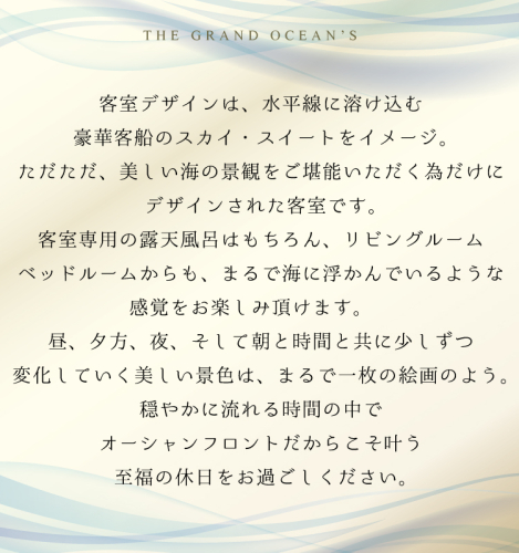 全94部屋の客室の中でも最高ランクの「ザ・グランド・オーシャンズ」は、豪華客船のスイートルームをイメージして作られた客室です。心地よい潮風と波の音、そして海の香り。静寂な至極の安らぎがもてなしてくれます。