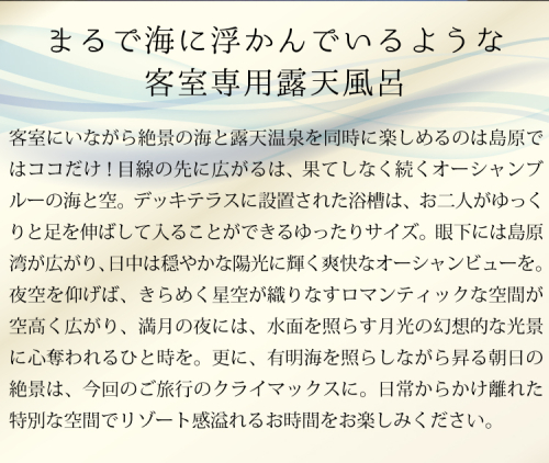 源泉かけ流し露天風呂から眺める青く澄み切った水平線。夜になると満天の星が輝き、夜が明けると朝日で有明海が茜色に染まっていきます。贅沢な緩やかな時と自然美に抱かれる上質な空間です。