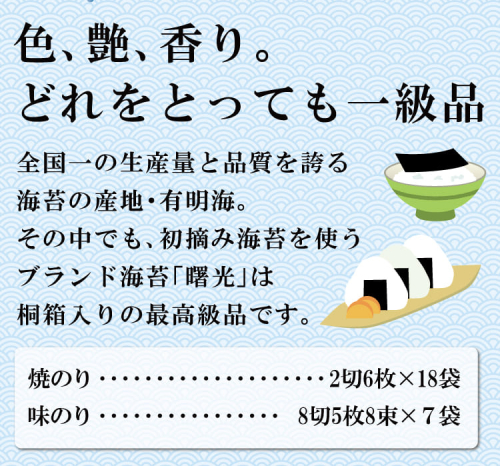 CA055 海苔 有明海産 初摘み 海苔セット 曙光 桐箱入り 焼のり2切108枚 味のり8切280枚[ 海苔 のり 味付け海苔 味付けのり 焼き海苔 味海苔 初摘み 有明海 国産 ご飯のお供 個包装 小分け 丸政水産 長崎県 島原市]