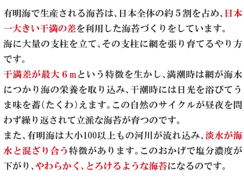 全国一の生産量と品質を誇る、海苔の産地・有明海。その中でも、初摘み海苔を使うブランド海苔「曙光」は、桐箱入りの最高級品です。