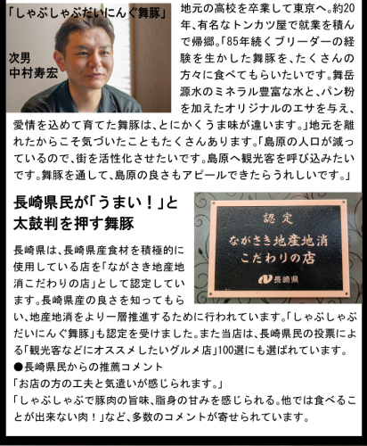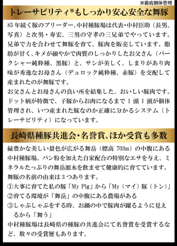 80年以上の歴史を持つ「中村種豚場」で生産され、種豚業の強みを活かして様々な品種を交配して生まれたのがこの「舞豚」です。