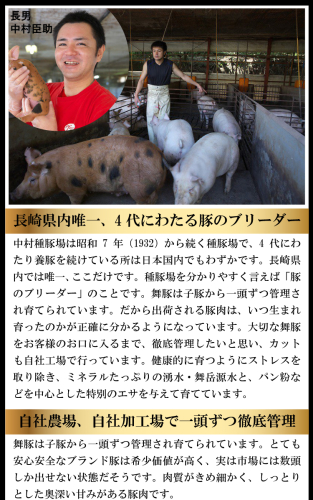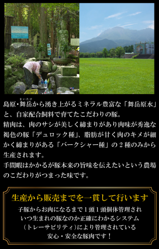 80年以上の歴史を持つ「中村種豚場」で生産され、種豚業の強みを活かして様々な品種を交配して生まれたのがこの「舞豚」です。 肉のサシが美しく締まりがあり肉味が秀逸な褐色の豚「デュロック種」、脂肪が甘く肉のキメが細かく締まりがある「バークシャー種」の2種のみから生産されています。 手間暇はかかるが豚本来の旨味伝えたいというこだわりが詰まった味です。 ※繁忙期は発送遅延の可能性あり。