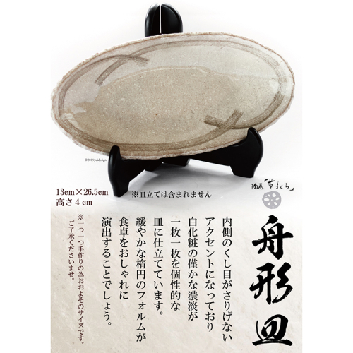 内側のくし目がさりげないアクセントになっており、白化粧の僅かな濃淡が、一枚一枚を個性的な皿に仕立てています。緩やかな楕円のフォルムが食卓をおしゃれに演出することでしょう。 <島原焼窯元 陶房草まくら>