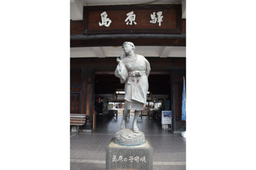 正面に島原城を見ることのできる島原駅で、列車出発時の合図や改札で切符に鋏を入れる体験ができます。