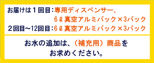 ・お届けは、1回目:専用ディスペンサー、6L真空アルミパック×3パック、2回目~12回目:6L真空アルミパック×3パックとなります。