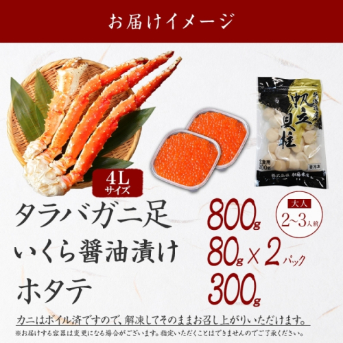 3415. カニ 蟹 タラバガニ足 800g 4L いくら醤油漬け 80g ホタテ貝柱 300g かに肉 カニ タラバ蟹 たらば蟹 タラバガニ 脚 たらばがに イクラ ほたて 帆立 食べ方ガイド・専用ハサミ付 ボイル 送料無料 北海道 弟子屈町