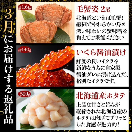 3月 毛蟹800g×2、いくら醤油漬け220g×2、ホタテ玉冷500g