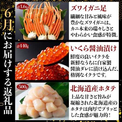 6月 ズワイガニ足800g×2、いくら醤油漬け220g×2、ホタテ玉冷500g