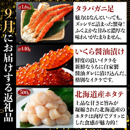 9月 タラバガニ足800g×2、いくら醤油漬け220g×2、ホタテ玉冷500g