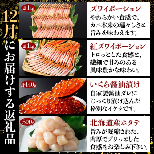 12月 ずわい蟹ポーション500g×2、紅ずわい蟹ポーション500g×2、いくら醤油漬け220g×2、ホタテ玉冷500g