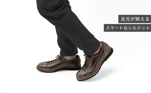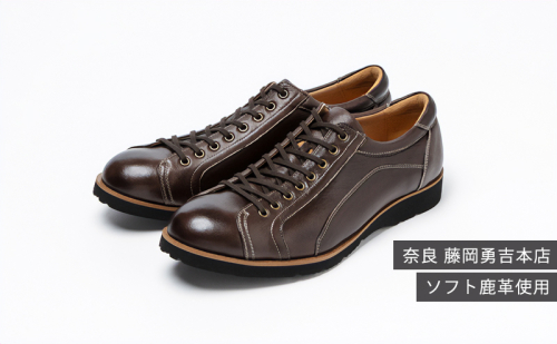 表革と中敷きに吸湿性、通気性が良くとても柔らかな鹿革を使用し足当たりがとてもソフトな履き心地。片足約290g(25.5cm片足基準)でとても軽量。鹿革は奈良県宇陀市「藤岡勇吉本店」で鞣されたオリジナル革を使用し、製造は奈良県大和郡山市というメイドイン奈良の逸品。インソールにも鹿革を使用した最上位モデルです。見た目はスリムだがゆったりとした足入れ感が特徴。ビジネス、カジュアルで兼用できるシンプルなデザインです。