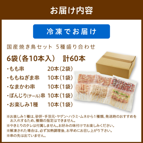 - 焼き鳥 60本 /国産焼き鳥セット 5種盛り合わせ60本 バラエティ 焼き鳥 セット <もも串焼き鳥/ねぎま焼き鳥/かわ焼き鳥/ テール(ぼんじり焼き鳥)串焼き鳥・冷凍焼き鳥・焼き鳥詰め合わせ・焼き鳥小分け>