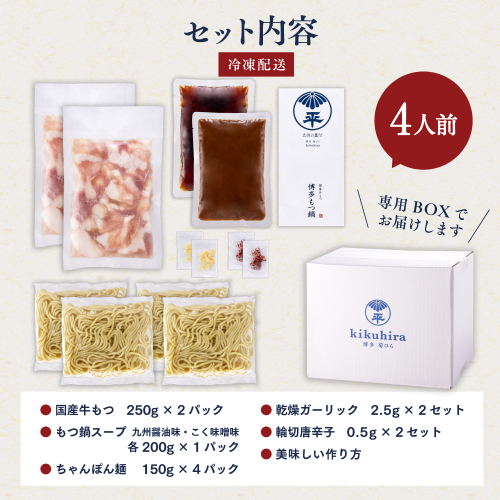 もつ鍋 食べ比べ セット 博多菊ひら 厳選 国産 若牛 もつ鍋 九州醤油味 こく味噌味 各2人前 [ベイシス福岡 福岡県 宇美町 um40azp130002] 牛もつ鍋 モツ鍋 モツ鍋セット 鍋 博多 詰め合わせ