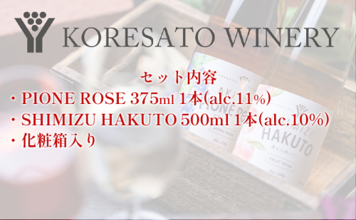 - PIONE ROSE 375ml 1本、SHIMIZU HAKUTO 375ml 1本、化粧箱入り