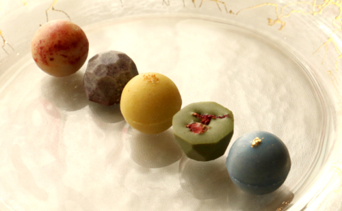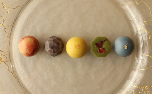 食材には、食材には、上品な香りを持ち栄養素の高いRawカカオ、スーパーフード、石川県内各市の特産品などを使用し、食材のもつ色素で九谷焼の五彩を表現しました。