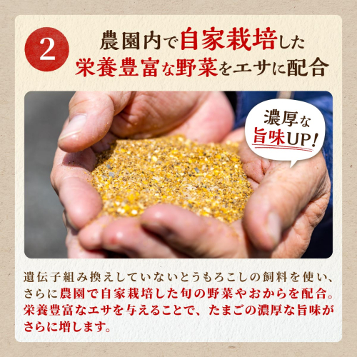 エサ:トウモロコシを主原料に、旬の自家栽培野菜で抗酸化作用UP!