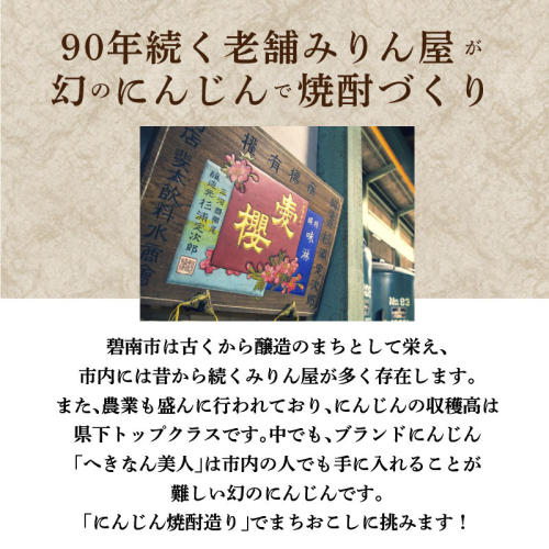 そんな碧南市を代表する産業であるみりん屋と幻のにんじんが「にんじん焼酎造り」でまちおこしに挑みます!