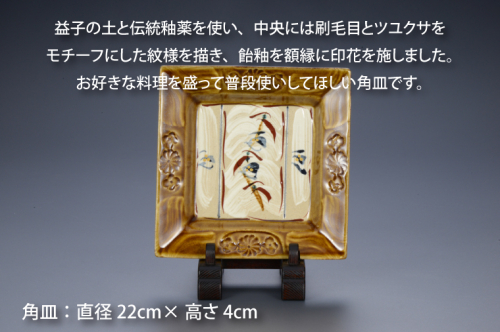 益子の土と伝統釉薬を使い、中央には刷毛目とツユクサをモチーフにした紋様を描き、飴釉を額縁に印花を施しました。 お好きな料理を盛って普段使いしてほしい角皿です。