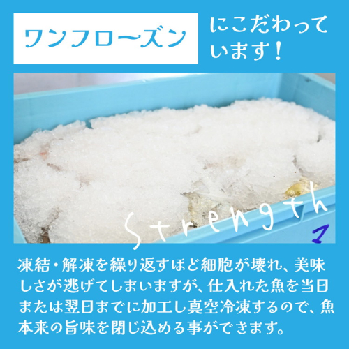 とれたての魚をその日のうちに下処理して、急速冷凍:真空パック。だから鮮度抜群です。