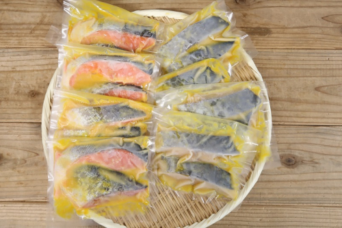 【説明】最強の西京漬けは何? 西京漬には、銀ダラ 、銀鮭 、サワラ 等ありますが、今回、銀鮭 とサワラ をセットにしました。どちらの方が美味しいか、食べ比べてください。2切入りが各4パックずつ入っています。凍った状態でも、手で小分けできます。冷凍庫で1ヶ月ほど保管していただけます。焼きたて はもちろん、西京漬は、冷めても美味しくお召し上がりいただけます。 焼津 さかなセンター の店頭(店舗名:マルショウ)や、インターネットのホームページ(店舗名:焼津屋)https://www.yaizu.com/でも、喜ばれている西京漬けです。