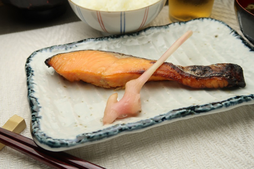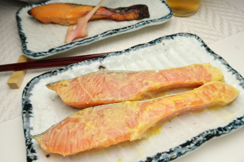 銀鮭西京原料:銀鮭(チリ)、味噌、砂糖、発酵調味液、食塩、甘味料(ステビア)、調味料(アミノ酸等)、クチナシ色素、(原材料の一部に大豆を含む)