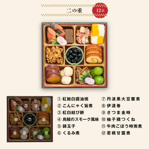 【二の重】紅鮭白醤油焼/こんにゃく旨煮/紅白結び餅/烏賊のスモーク風味/錦玉子/くるみ煮/丹波黒大豆蜜煮/伊達巻/さつま金時/柚子鶏つくね/牛肉ごぼう時雨煮/若桃甘露煮