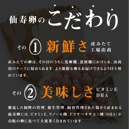 名古屋コーチンの卵は通常の鶏卵に比べ、白身より黄身の割合が大きく、こんもりと膨らんだ黄身は濃厚な味わいで、白身は弾力があってするっとしたのど越しが特徴です。 当社ブランドの仙寿卵は最高品質の飼料で育成され、抗生物質等の薬品添加物は一切使用していません。また、鶏の健康を考え、開放式の鶏舎で一羽一羽に太陽の光と風を感じられる環境で育てています。 生まれたての雛から手塩にかけて育て、新鮮さ、美味しさ、安全性を追求したこだわりの卵をぜひご賞味ください。 ※写真はイメージです。 ※北海道、沖縄、離島諸島への配送は出来ません。ご了承ください。 ※卵の生育不良により、お届けに2ヵ月~3ヵ月ほどお時間をいただく場合がございます。予めご了承ください。 ■地場産品基準 区域内で生産されたもの。