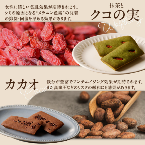 全卵(国産)、バター、エリスリトール、ミックス粉(小麦たんぱく、小麦ふすま、大豆粉、その他)、アーモンド、転化糖、砂糖、抹茶、クコの実、ラカンカエキス/加工澱粉、トレハロース、膨張剤、増粘多糖類、甘味料(ラカンカ抽出物)