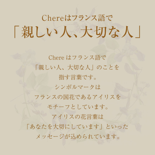 Chereはフランス語で「親しい人、大切な人」の事を指す言葉です。シンボルマークはフランスの国花であるアイリスをモチーフとしています。アイリスの花言葉は「あなたを大切にします」といったメッセージが込められています。