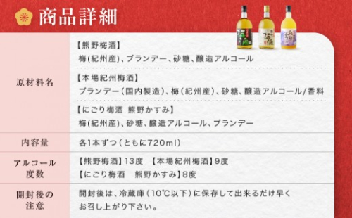 原材料:原材料名:熊野梅酒:梅(紀州産)、ブランデー、砂糖、醸造アルコール 本場紀州梅酒:ブランデー(国内製造)、梅(紀州産)、砂糖、醸造アルコール/香料 にごり梅酒 熊野かすみ:梅(紀州産)、砂糖、醸造アルコール、ブランデー