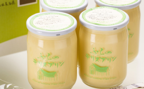 レシピはふらの牛乳プリンと同じですが、キャップが特殊で冷蔵保存で2週間の日持ち。いちばん基本のプレーン4本詰です。