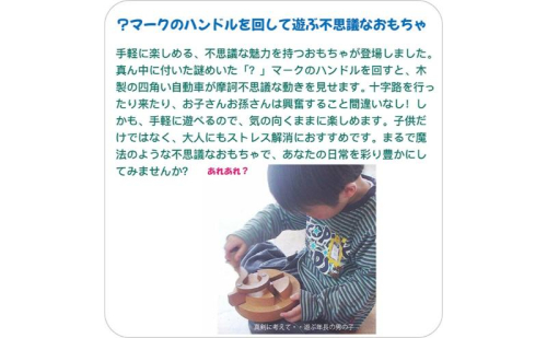 ★日本グッド・トイ受賞おもちゃ 手軽に楽しめる、不思議な魅力を持つおもちゃが登場しました。真ん中に付いた謎めいた「?」マークのハンドルを回すと、木製の四角い車に見立てた木片が摩訶不思議な動きを見せます。十字路を行ったり来たり、お子さんお孫さんは興奮すること間違いなし! 手軽に遊ぶことができます。日本グッド・トイ受賞おもちゃ