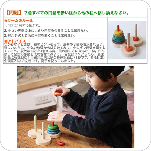 - 赤ちゃんも高齢者も楽しめる万能玩具・ハノイの塔の知育玩具が入っています。おもちゃの材質はブナ材 日本製