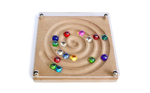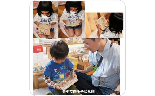 それは果てしなく広がり続ける宇宙のように。渦を描く溝は銀河系の星雲に、ビー玉は地球や火星といった美しい惑星達に見立てて作りましたこのおもちゃは、渦の中でビー玉をクルクルと回したり、ビー玉同士をぶつけてカラカラと心地よい音を響かせて楽器のように楽しんだり、子供さんの思いつくままに様々な遊び方をする事が出来ます。