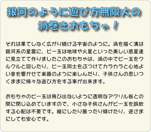遊び心は宇宙の果てまで・・・ 果てしなく成長し続ける宇宙の仕組みーーー渦まく星雲ーーー美しい銀河系 その中で輝く恒星そして太陽系ーーー青い惑星地球ーーー赤い火星 その美しい宇宙をおもちゃにしました。 ビー玉の輝きや色を星にたとえて遊びます。 カラカラカチンと弾けるビー玉の美しさと動きを楽しみます。