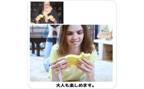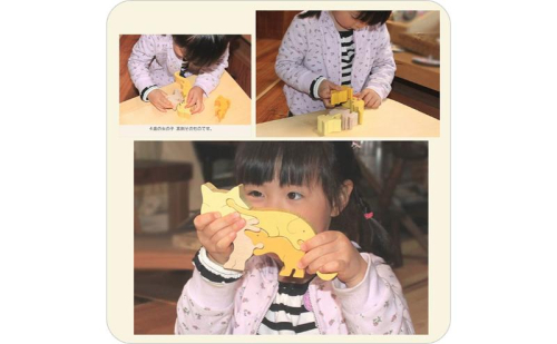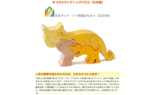 - ウサギ、イヌ、ゾウのピースを組み立てると1匹の猫になる知育パズルが入っています。おもちゃの材質はブナ材 日本製 psc