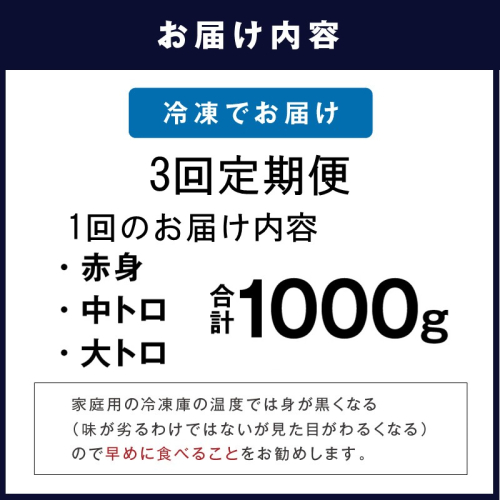 【全3回定期便】鷹島本まぐろ 赤身・中トロ・大トロ合わせて1000g( マグロ まぐろ 赤身 中トロ 大トロ 本まぐろ 手軽 おつまみ 柵 流水解凍 )【K26-001】
