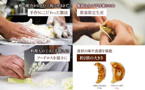 クセのない脂と上品な肉質が特徴のブランド豚『かみふらのポーク』や豊かな自然の中で採れた新鮮なふらの野菜に加え、皮には餃子に適したモチモチ感を生むふらの小麦を使用している、まさに『皮から餡までふらの食材にこだわった』餃子です。