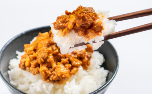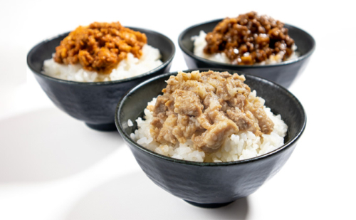 バター醤油、デミグラス、コチュジャンベースのピリ辛ナッツ、異なる3種の味つけをした豚そぼろはご飯のお供としてはもちろん、和・洋・中 様々な料理にアレンジすることでより美味しくお召し上がりいただけます。