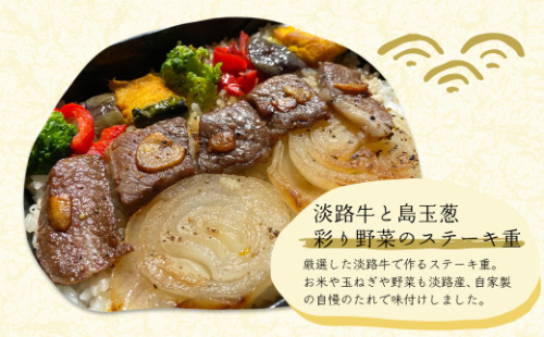 (1)厳選した淡路牛で作るステーキ重。お米や玉ねぎや野菜も淡路産、自家製の自慢のたれで味付けしました。