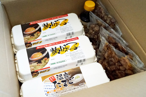 - AE139 島原のたまご 黄味子Dセット (卵10個入×2パック,温泉たまご10個入×1パック,やきとり塩焼き・タレ焼き(180g)×各1,玉子ごはん用醤油×1本)