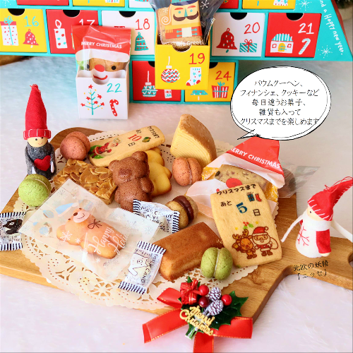 内容量:マドレーヌ、チョコ、クッキー、パウンドケーキ、フィナンシェなど12月1日から12月24日までのお菓子